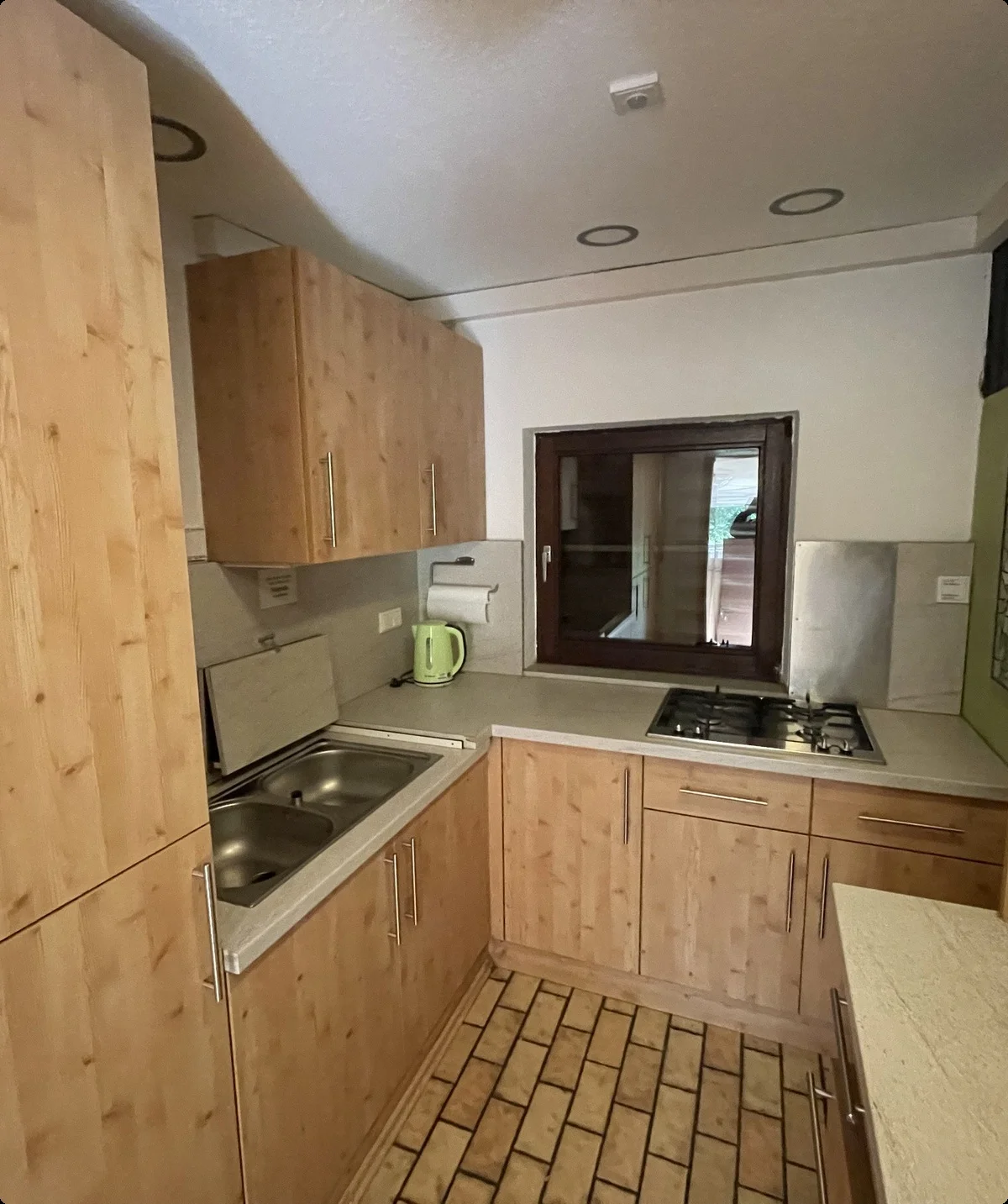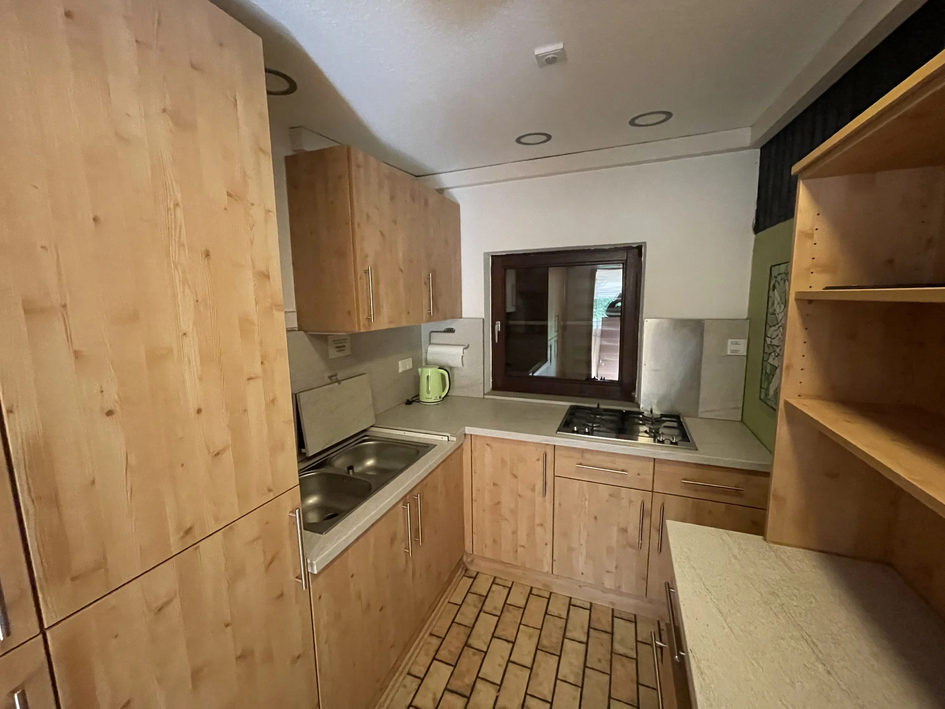 - Komplett ausgestattete Küche mit Gaskochfeld (keine Backröhre), elektrischer Wasserkocher, Geschirr, Besteck, Töpfe, Pfannen, Kochbesteck, Gläser, Salz-, Pfeffermühle, Kaffeefilter Gr. 2, 4